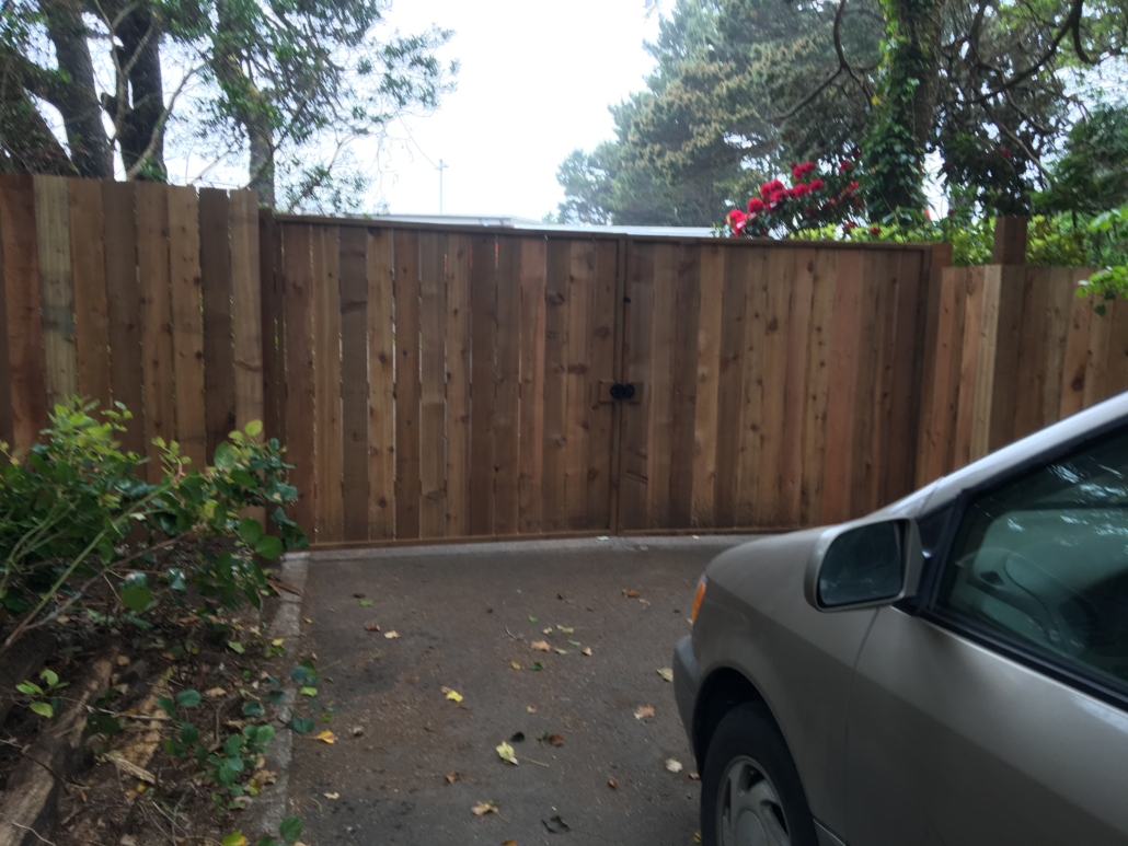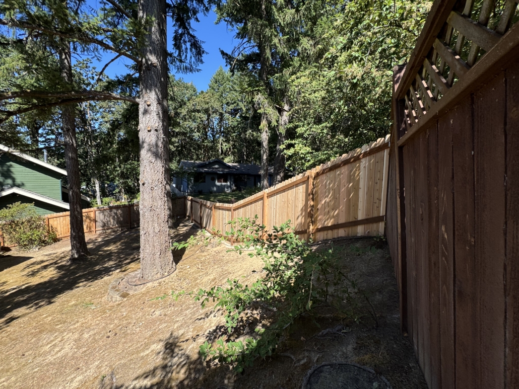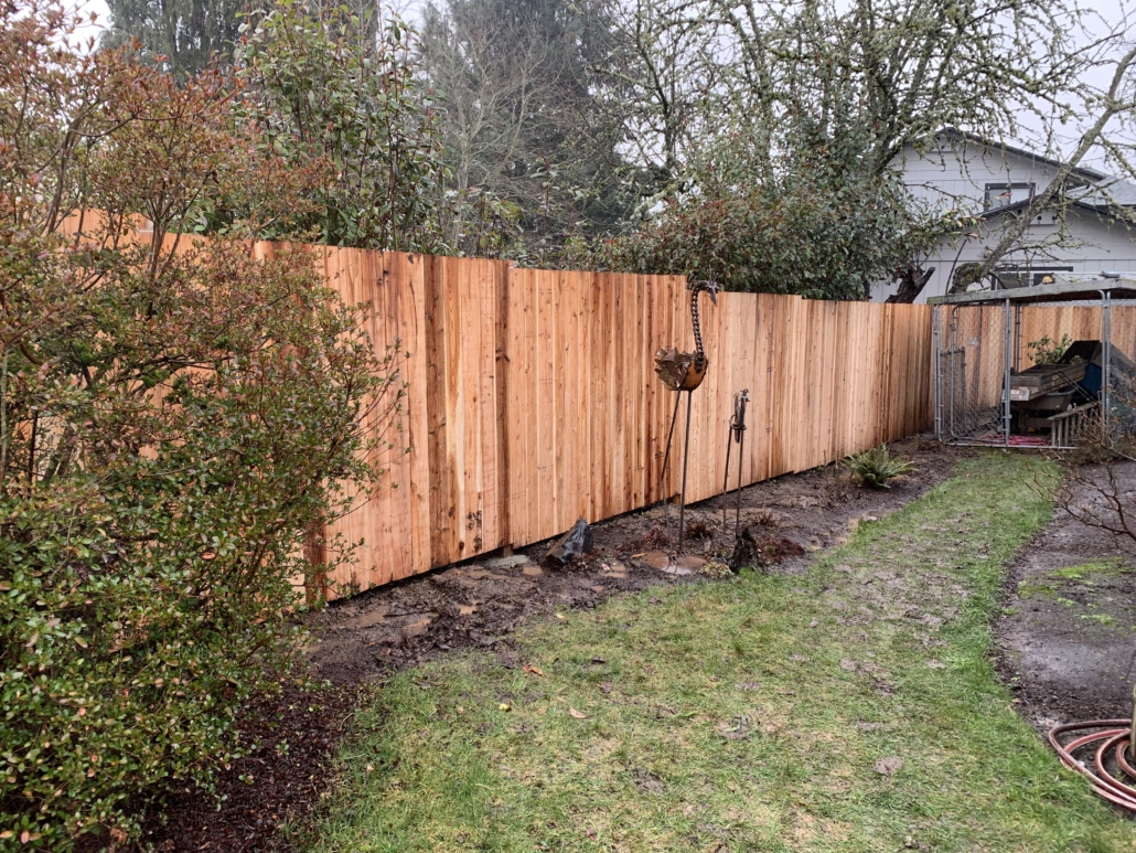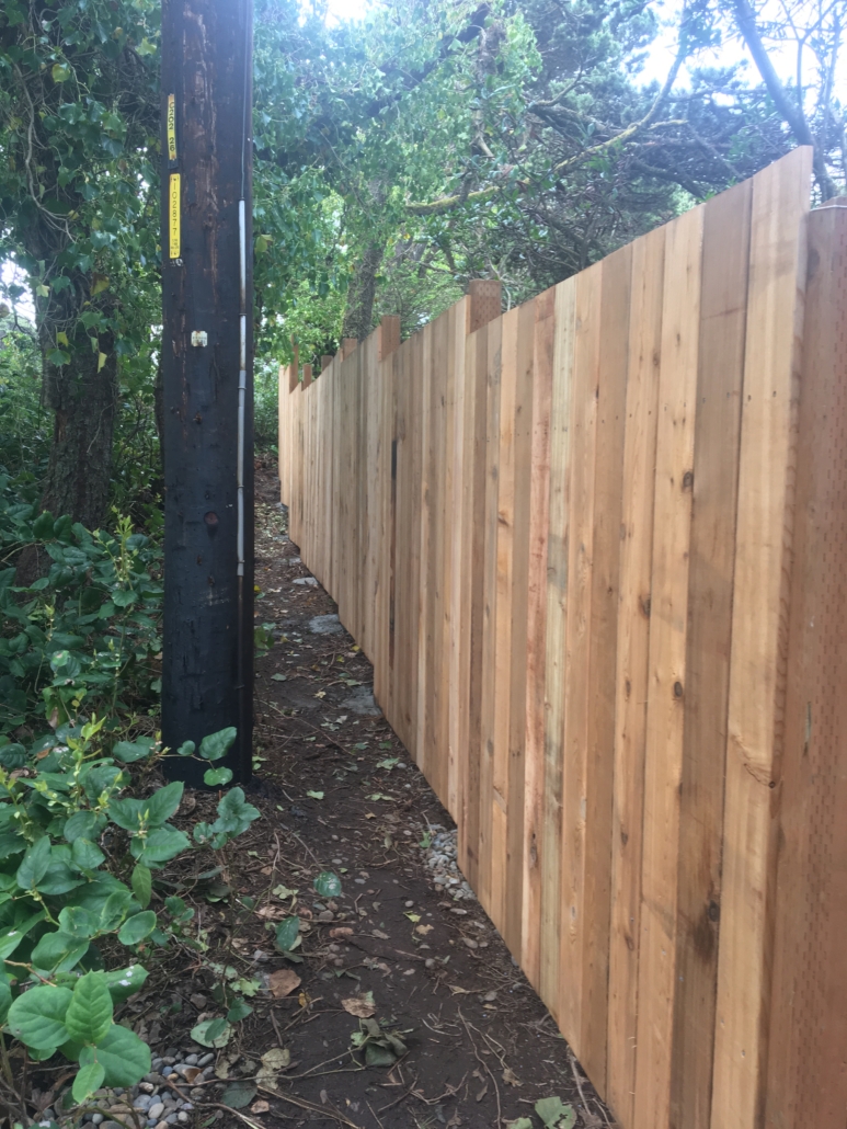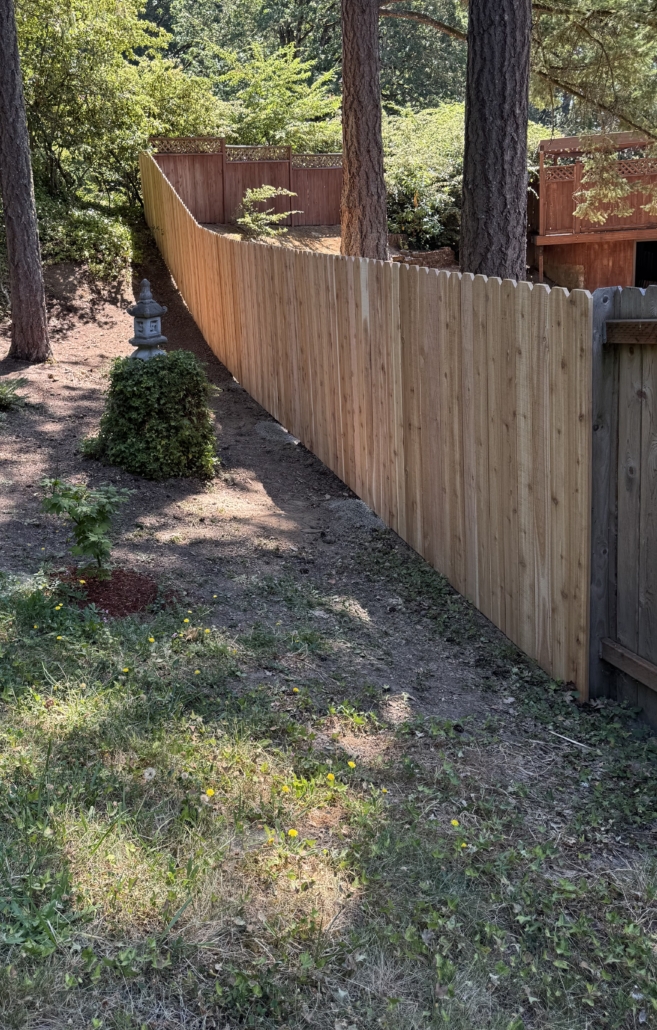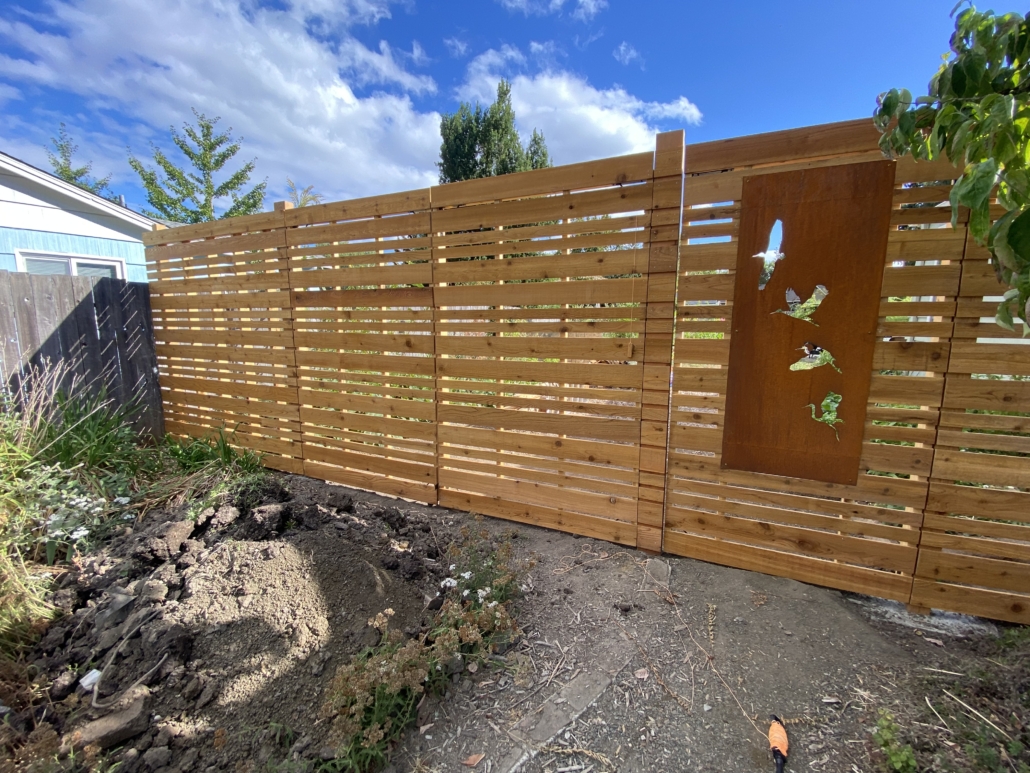 We install all kinds of fences. The horizontal fence was something a client had seen around town and wanted to emulate. They requested the left side of the fence be 7’ tall in order to stop deer from getting into their yard. The left side of the fence is comprised of three gates. Two large gates allowing for bringing in large amounts of gardening materials along with a decorative daily use gate. The client also wanted the gates to be framed to accommodate decorative copper plates. The other fences are cedar as well, all in a more traditional privacy design. We can stain or leave them raw.