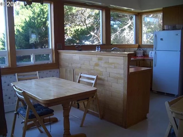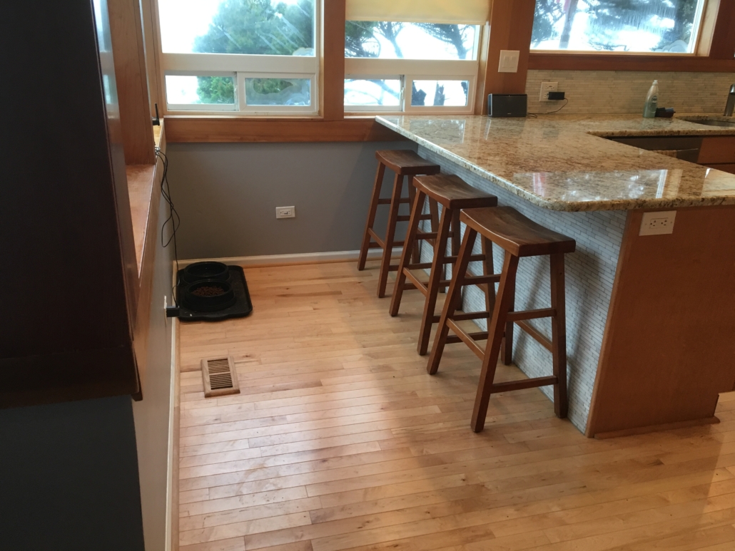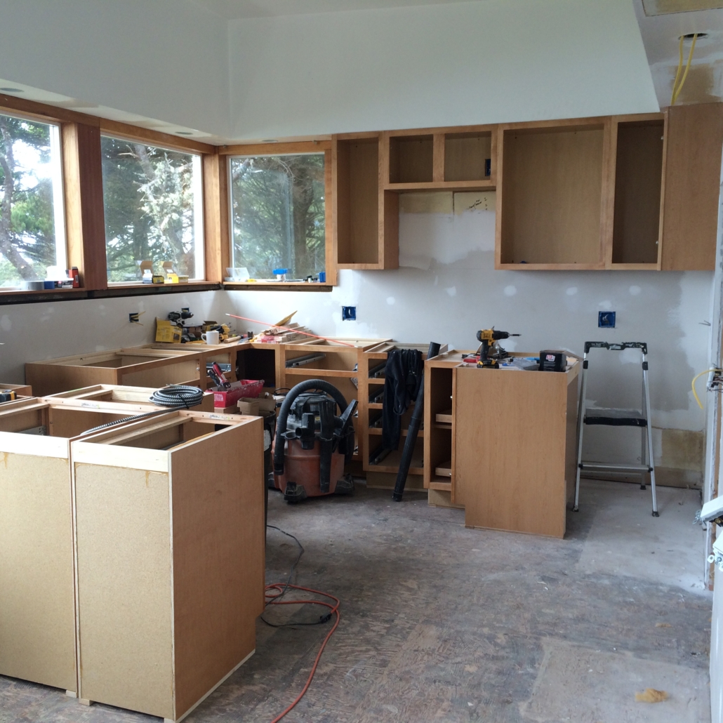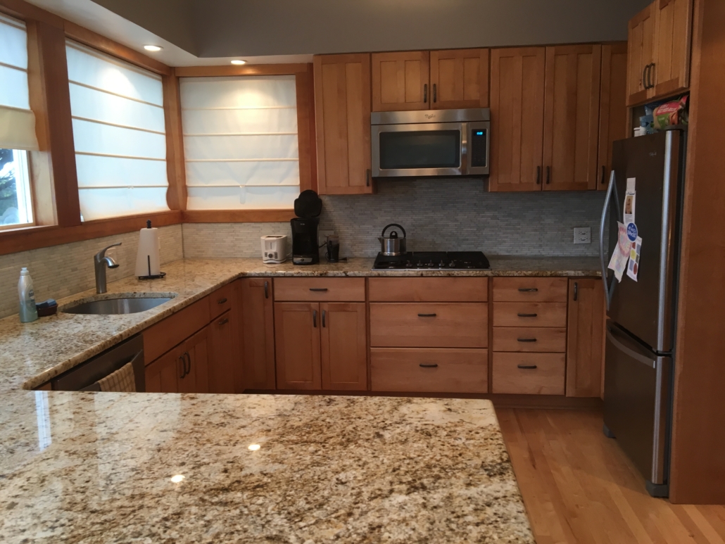 Part of the whole house Newport Remodel, the kitchen was one of the main focal points of the house. A layout and design were created to optimize the space, allowing ample room for moving around, while enough room left over for sitting at the overhang countertop. The entire kitchen area was completely gutted, all rot removed and replaced with new lumber. Vapor barriers and new drywall were installed. Cinnamon colored cabinets/bases and brass handles were installed. Tile backsplashes were installed along with all new appliances and new granite countertops. Proper underlayment and bamboo flooring were knocked in and all new trim installed.